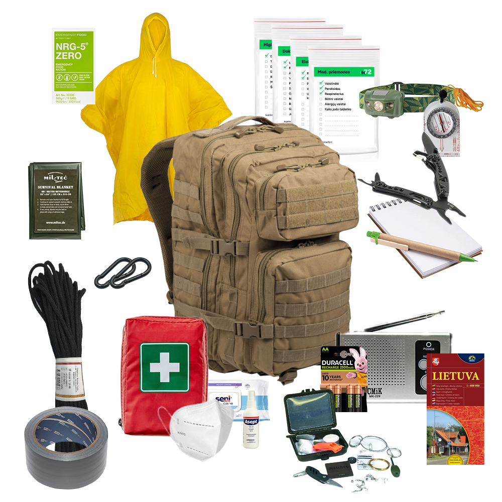 - Taktinis išgyvenimo rinkinys (Ugnies skeltukas, peiliukas, žvakė, siuvimo rinkinys, rankinis grandininis pjūklelis, žvejybos komplektas, signalinis švilpukas)