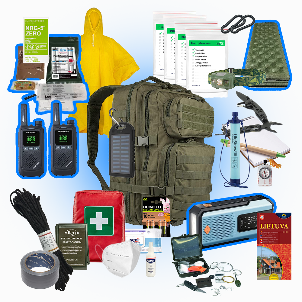 ULTRA kuprinėje rasite viską, kas yra Maxi, + Racijas, Radija su rankiniu bei saulės krovimu, kilimėlį ir karšto maisto pakuotę!