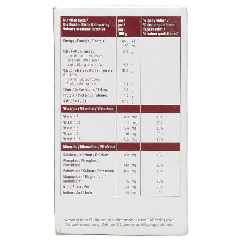 Sudėtis: Kepinta kviečių, palmių riebalai, cukrus, sojos baltymai, miežių salyklo ekstraktas, Di-kalio fosfatas, Kalio chloridas, Tri-kalcio fosfatas, Kalcio karbonatas, Magnio oksidas, Anhidras dextrozė, Askorbo rūgštis (vitaminas C), Geležies sulfatas, DL-alfa-tokoferilo (vitaminas E) acetatas, Retinilis (vitaminas A) acetatas, Cholekalciferolis (vitaminas D3), Cianokobalaminas (vitaminas B12).