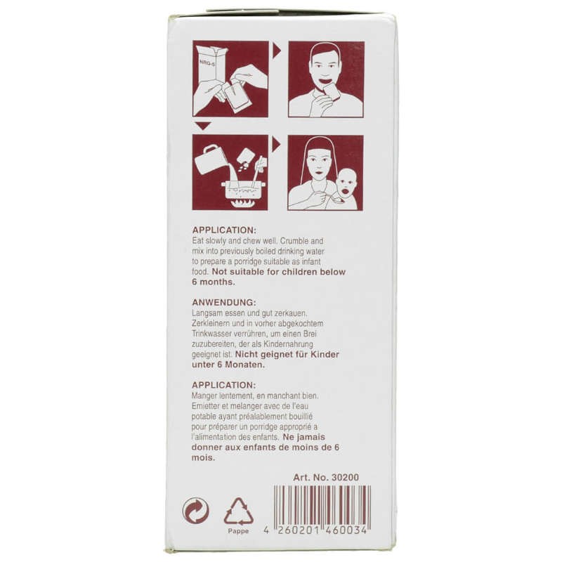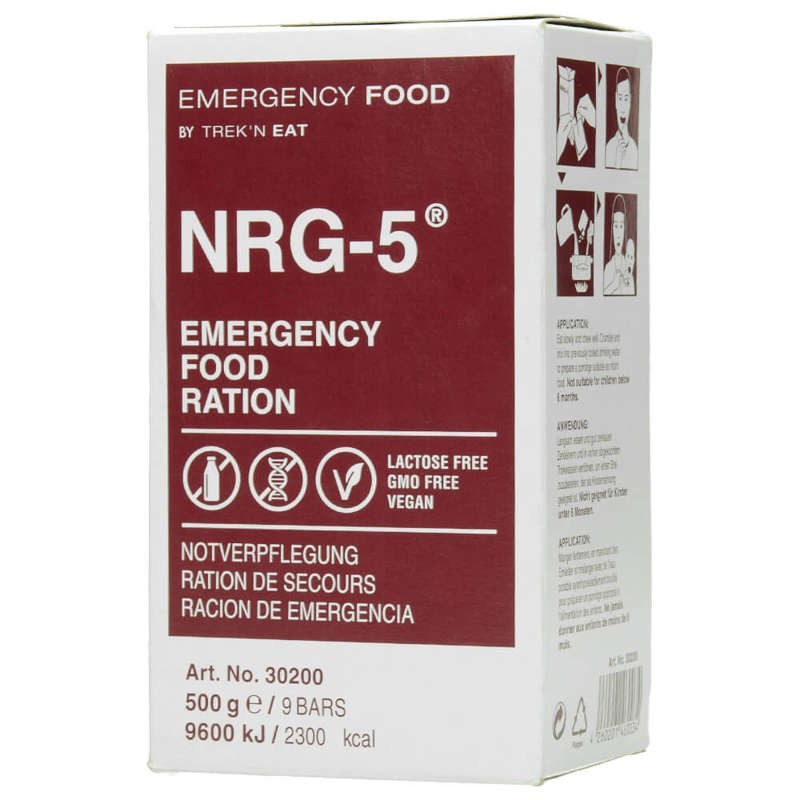 NRG-5® pakuotė (500 g / 2300 kcal) padengia suaugusio žmogaus kasdienius energijos poreikius. Paruošta vartoti, nereikia šildyti ar virti. Galima duoti vaikams nuo 6 mėnesių amžiaus. Sutrynus suspaustas juostas ir pridedant vandens, galima paruošti maistingą košę arba energetinį gėrimą, priklausomai nuo to, kiek vandens pridedate.