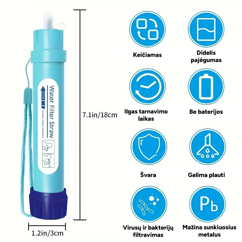 Išgyvenimo vandens filtras ekstremalioms situacijoms. Šis vandens filtro šiaudelis buvo laboratoriškai išbandytas SGS tarptautinėje laboratorijoje, o medžiaga atitinka PSO standartus. Jei norite paprastai ir greitai gauti švaraus geriamojo vandens, galite naudoti šį išgyvenimo vandens filtrą. Nešiojama sistema idealiai tinka poilsiui, žygiams, stovyklavimui. Tai taip pat geras jūsų palydovas žvalgybai, kelionėms bei pasirengimui ekstremalioms situacijoms.